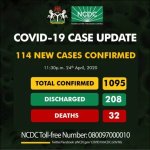 It said: “As at 11:30 p.m. 24th April there are 1,095 confirmed cases of #COVID19 reported in Nigeria.